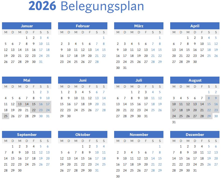 Damit Sie Ihre Urlaubsplanung ganz entspannt gestalten können, finden Sie hier unseren aktuellen Belegungsplan.