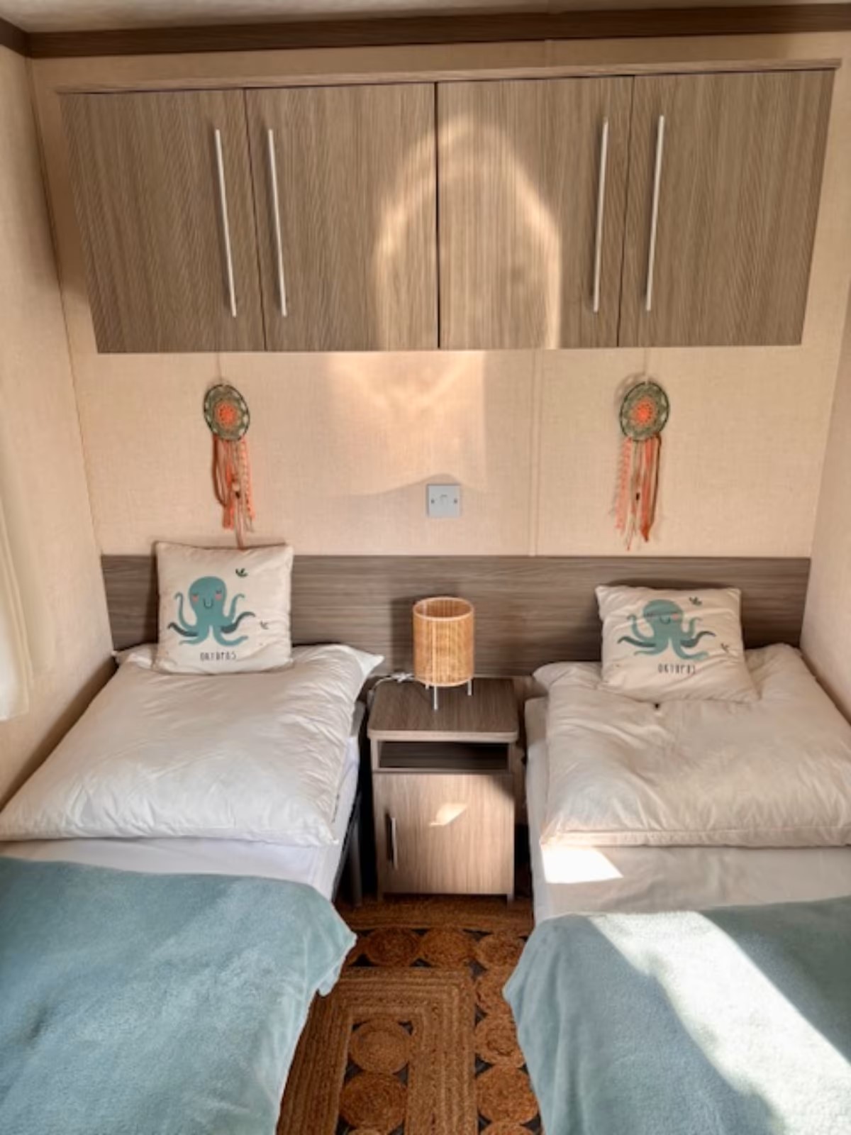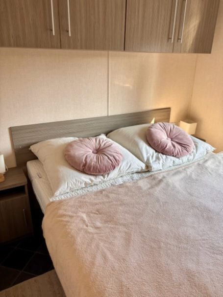 Im Elternschlafzimmer befindet sich ein Doppelbett (160x200), während das Kinderzimmer zwei Betten (70x185) bietet, die bei Bedarf zusammengeschoben werden können. Ein Rausfallschutz ist ebenfalls vorhanden.