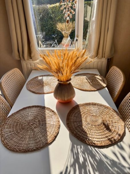 Der offene Wohn- und Essbereich lädt zum Verweilen ein: Ein Flat-TV, eine bequeme Couch und ein Esstisch für vier Personen sorgen für Komfort und gesellige Stunden.