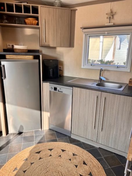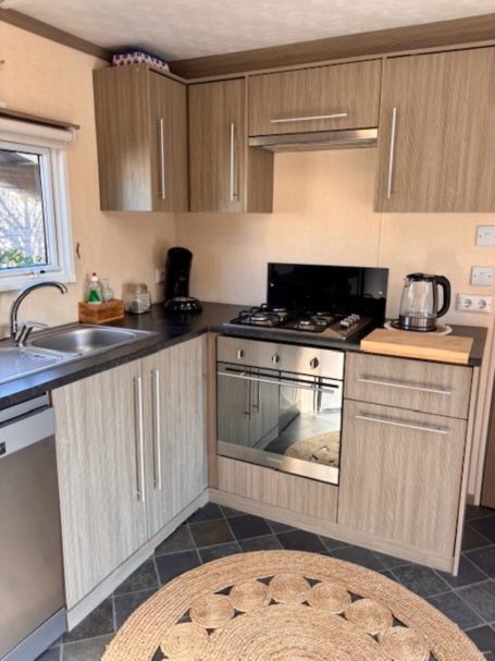 Die Küche des Chalet ist ausgestattet mit Spülmaschine, Kochfeld, Backofen, Senseo-Kaffeemaschine, Toaster, Wasserkocher, Airfryer sowie Kühlschrank.